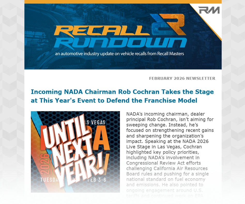 Stay up to date and connected to all issues related to the automotive industry and associated recall and retention news. The Recall Rundown is the only monthly newsletter dedicated to automotive recalls, retention and topics impacting dealerships and OEMs… Click here to read the January 2026 Recall Rundown issue.